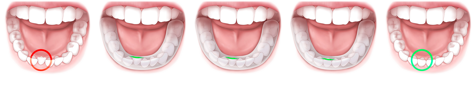 Die herausnehmbaren Schienen übertragen sanfte kontrollierte Kräfte auf die Zähne Ein Alignerpaar bewegt die Zähne sehr behutsam um 0,25 bis 0,33 mm. Danach wird es gegen ein neues Paar ausgetauscht.